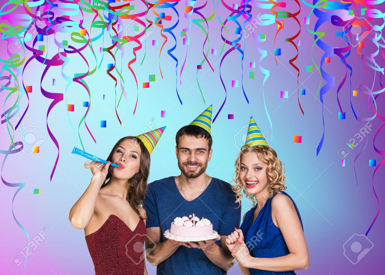 Tres Personas Felices Celebrando Una Fiesta De Cumpleanos Fotos Retratos Imagenes Y Fotografia De Archivo Libres De Derecho Image 40534166