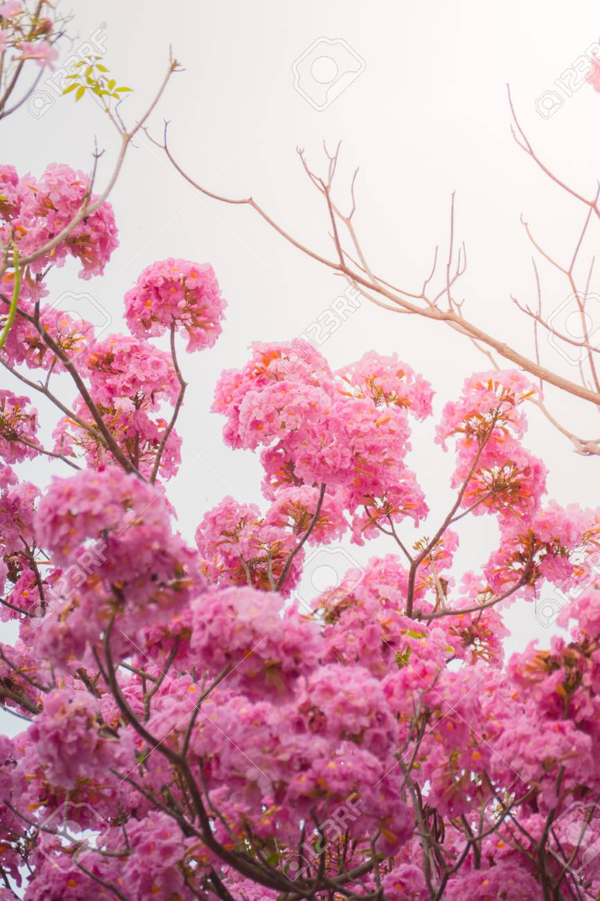 Flores Rosas En El Arbol De Flor En El Cielo Azul Fotos Retratos Imagenes Y Fotografia De Archivo Libres De Derecho Image 8928514