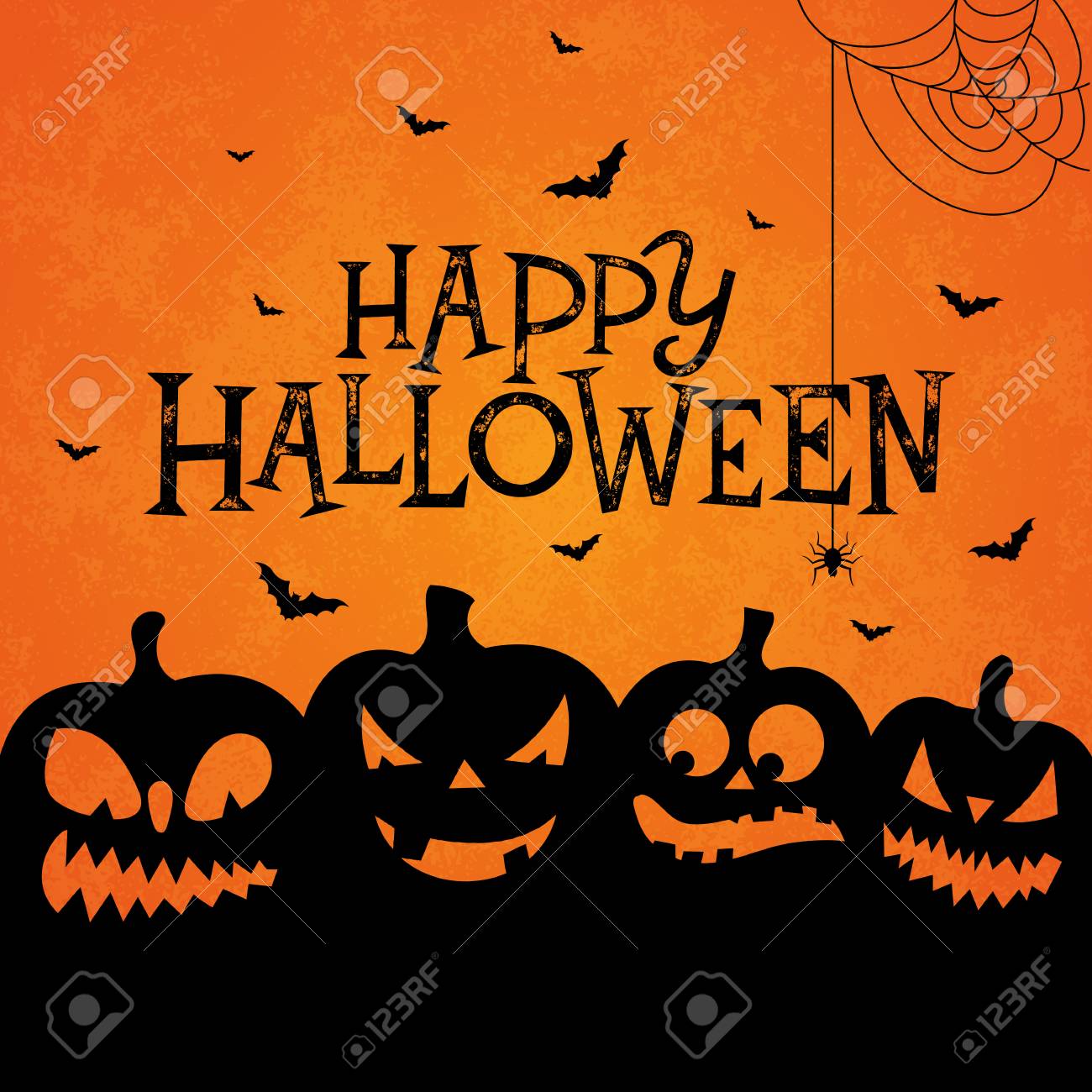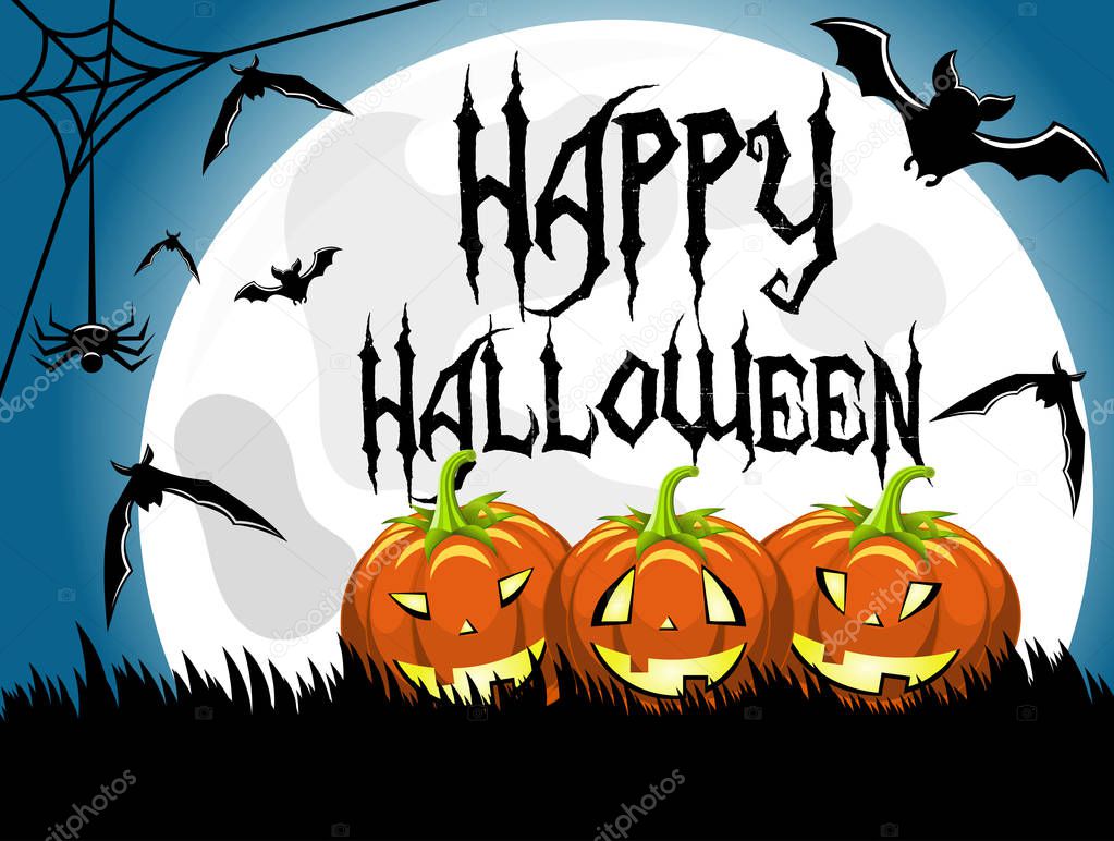 Happy Halloween Banner Illustration With Scary Faced Pumpkins And Flying Bats On Orange Background Vector Holiday Design Template With Typography Lettering For Greeting Card Flyer Celebration Poster Or Party Invitation Clip Art