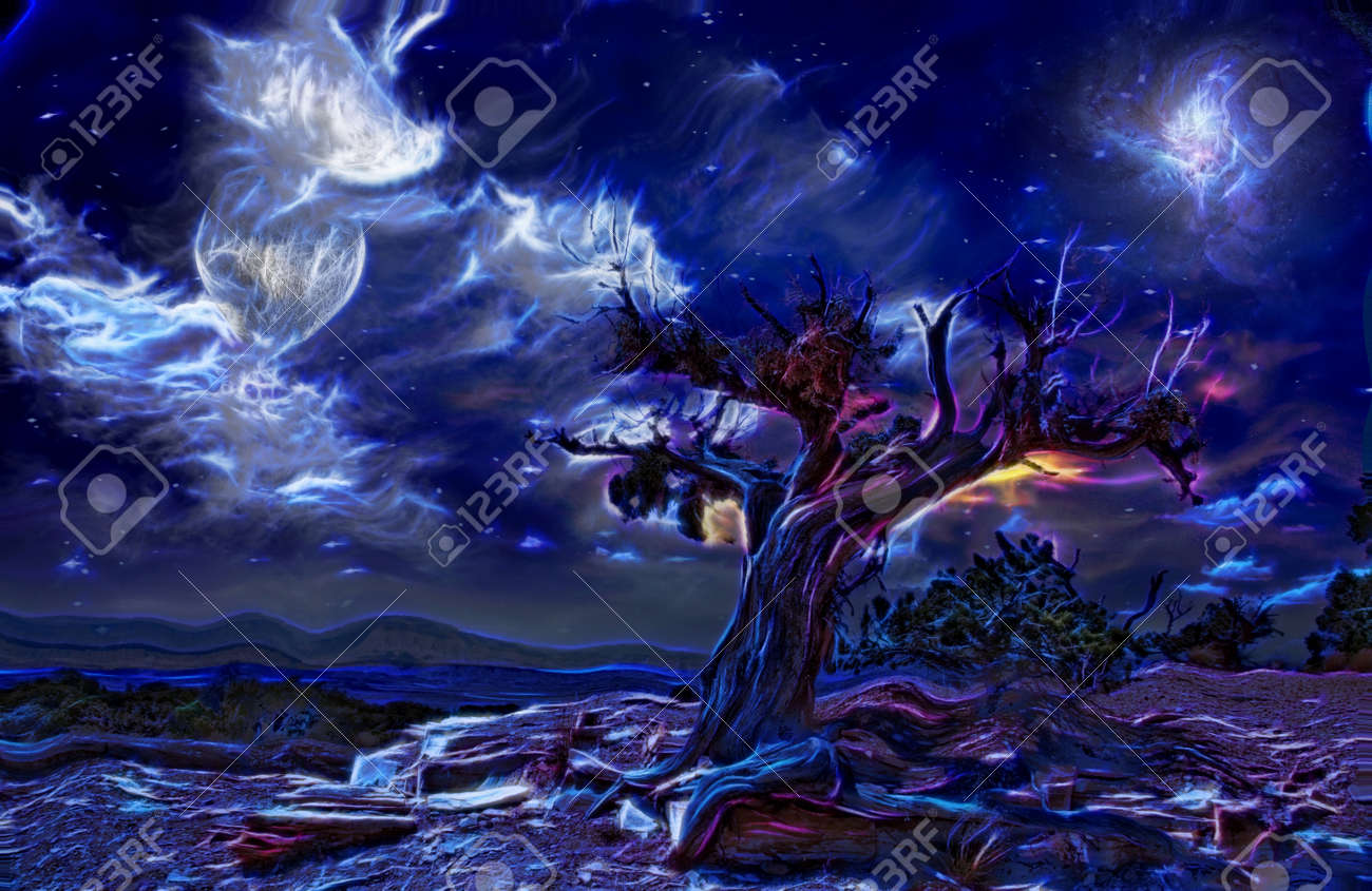 Pintura Surrealista Arbol Viejo Luna Llena Y Nubes Misticas En El Cielo Fotos Retratos Imagenes Y Fotografia De Archivo Libres De Derecho Image 80004366