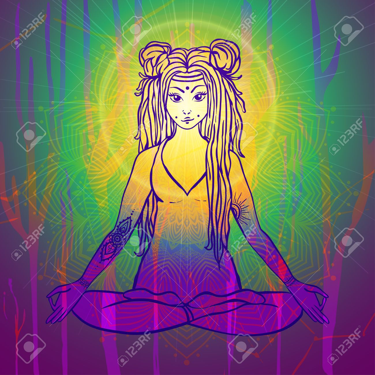 Chica Hippie Con Rastas Yoga Estilo Hippie Plantea Amor Y La Musica Con Las Fuentes Escritas A Mano Chica Hippie Dibujado A Mano Estilo Bohemio Ilustracion Vectorial De Color Hippy 60s Retro