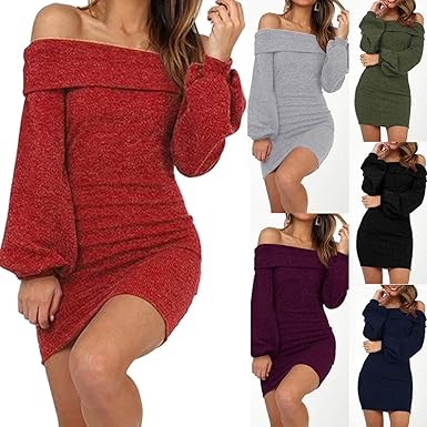 Vestidos De Fiesta Mujer Cortos Otono Invierno Sueter Camisetas Vestido Sexy Delgado Con Cuello Halter De Un Hombro Y Manga De Linterna Para Mujer Jesery Amazon Es Ropa Y Accesorios