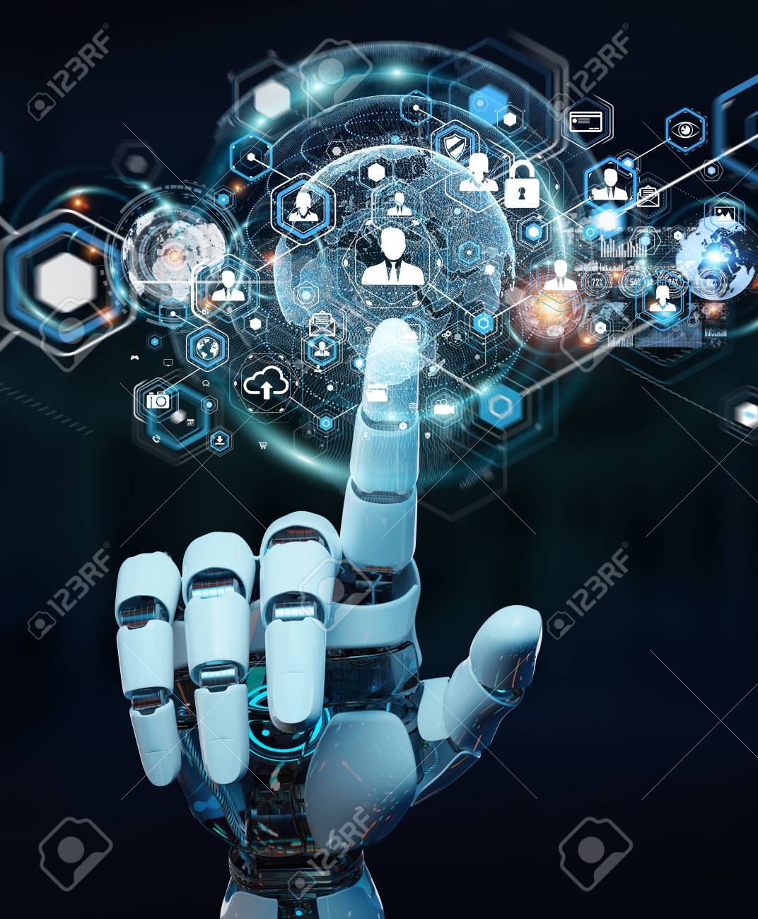 White Robot Hand On Blurred Background Using Digital Screen Interface Stock Photo Picture And Royalty Free Image Image 100538707