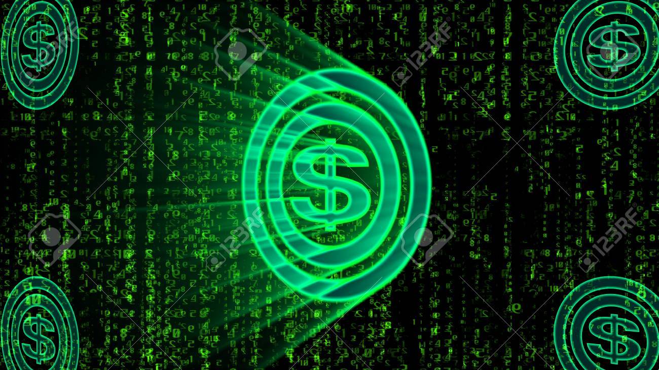 Uma Ilustracao 3d Impressionante De Um Sinal De Dolar Bitcoin Verde Colocar No Centro De Dois Circulos Brilhantes No Fundo Preto Coberto Com Linhas De Linhas De Estilo Matrix Colocadas Obliquamente No
