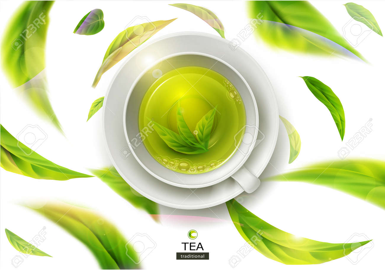 Vector A Ilustracao 3d Com As Folhas De Cha Verde No Movimento Em Um Fundo Branco E Na Caneca Ceramica Com O Saucer Com Cha Verde Elemento Para Design Publicidade Embalagem De