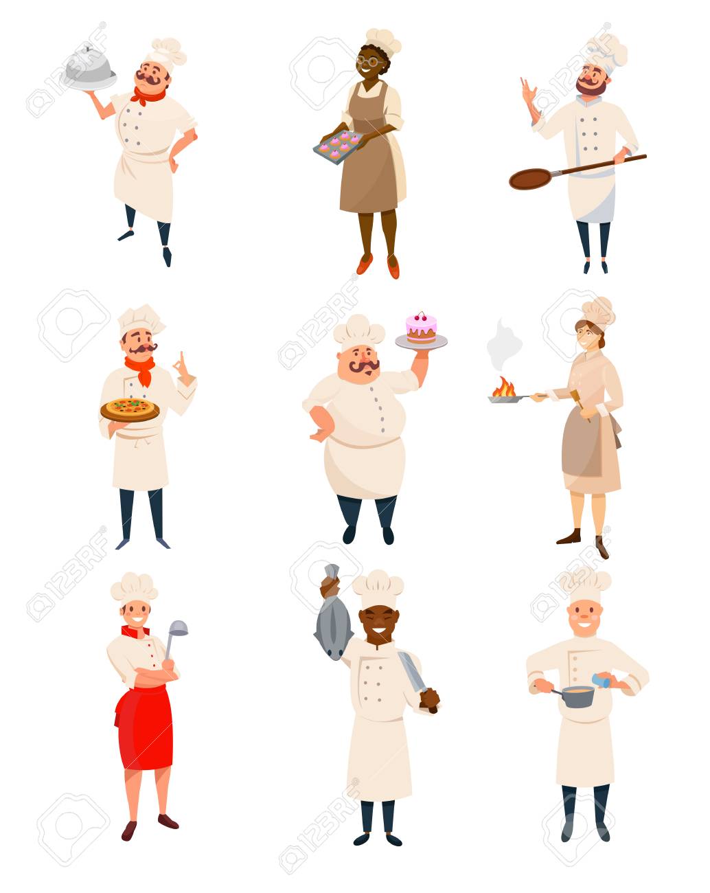 Conjunto De Chefs De Restaurante Com Diferentes Utensilios De Cozinha E Pratos Nas Maos Trabalhadores De Cozinha Profissional Em Estilo Simples Homens Dos Desenhos Animados E Carateres Das Mulheres No Uniforme Do