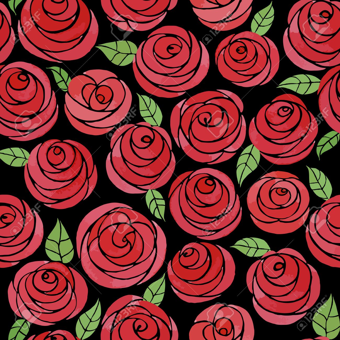 Modelo Inconsutil Con Las Rosas De La Acuarela Lindos Cute Dibujos Animados Rosas Rojas Con Hojas Flores Jugosas En Un Fondo Negro Ilustraciones Vectoriales Clip Art Vectorizado Libre De Derechos Image 40972822
