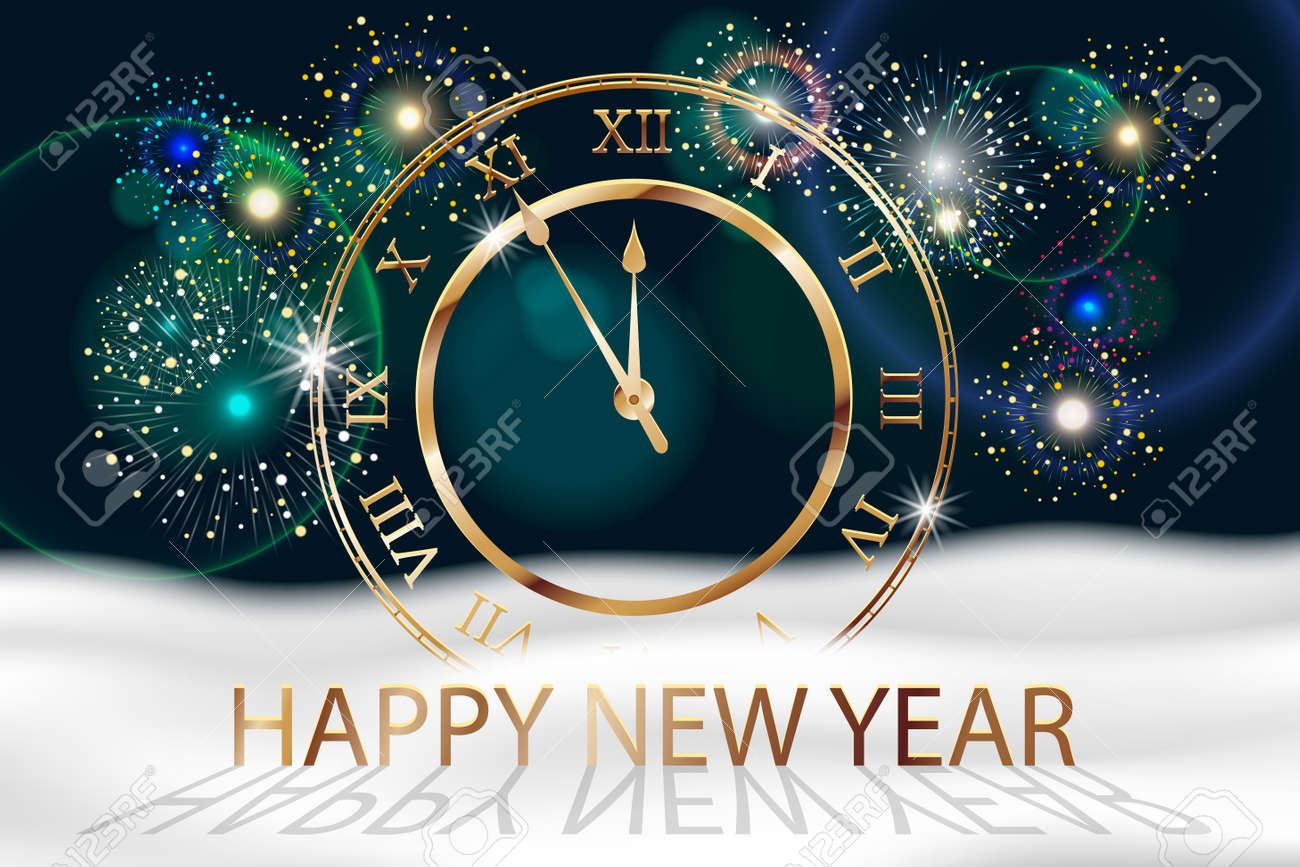 Vector Holiday Fireworks Background Com Relogio Antigo De Ouro Feliz Ano Novo 2018 Sreetings Design Colorido De Fogos De Artificio Com Neve Branca Ilustracao Do Vetor Ilustraciones Vectoriales Clip Art Vectorizado Libre