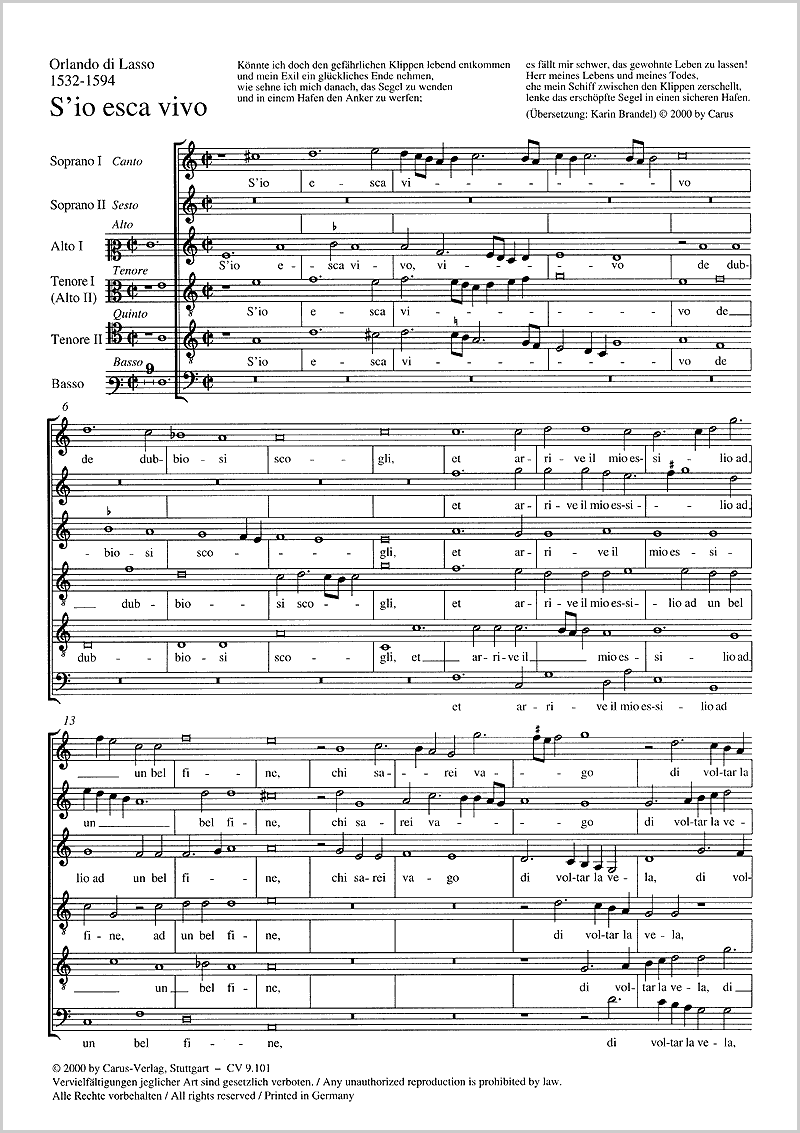 Orlando Di Lasso S 039 Io Esca Vivo Full Score Carus Verlag
