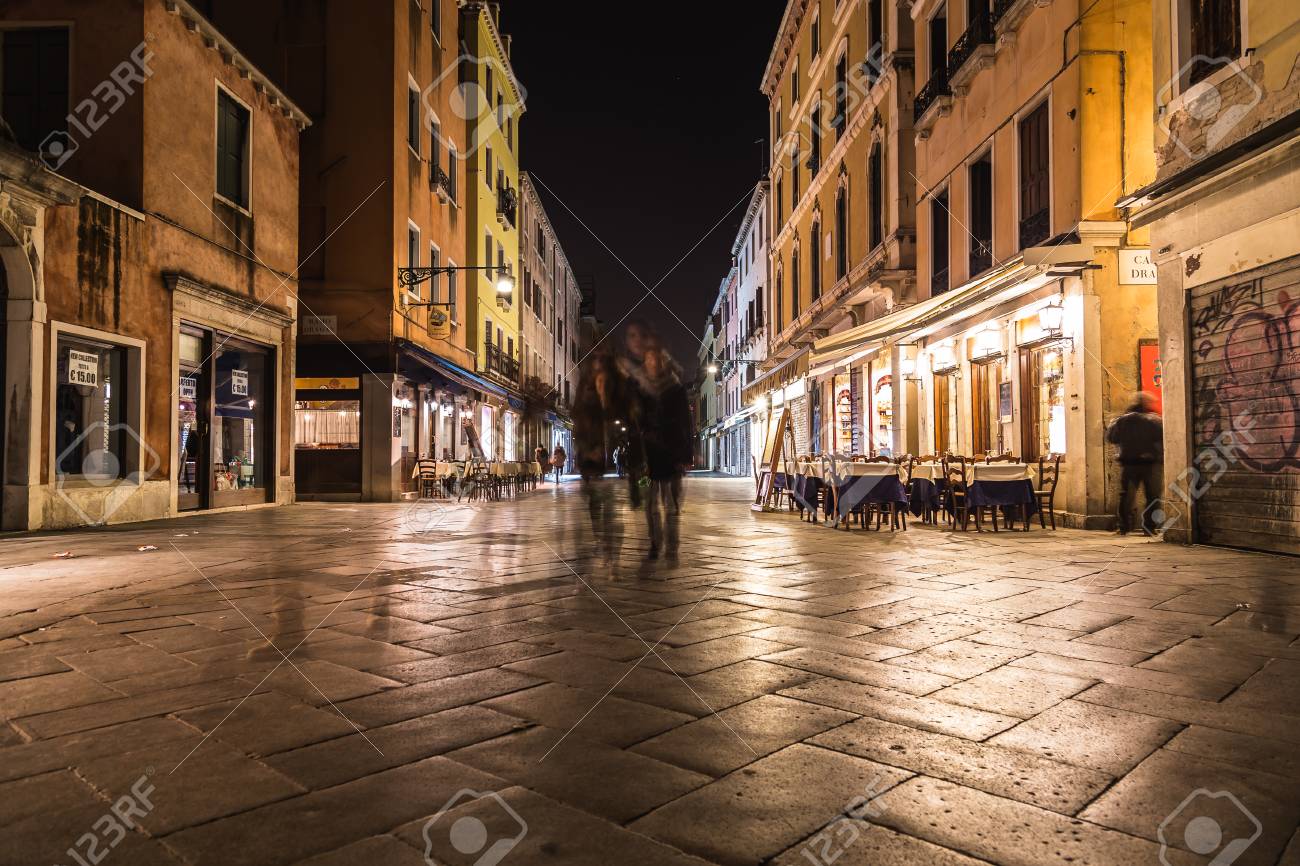 Venice Italy 13th March 2015 Strada Nuova In Venice At Night Showing Shops Restaurants And The Blur Of People Walking Foto Royalty Free Gravuras Imagens E Banco De Fotografias Image 53738871