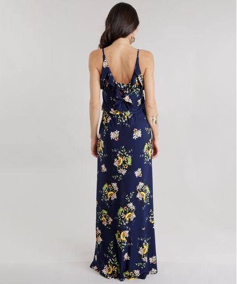 Vestido Longo Estampado Floral Com Babados Azul Marinho Cea