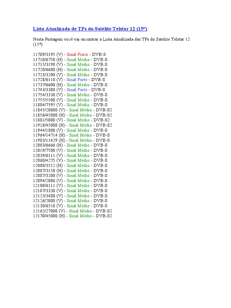 Lista Atualizada De Tps Do Satelite Telstar 12 15