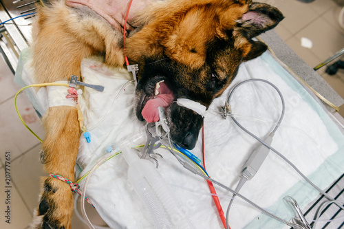 German Shepherd Lying Unconscious In Veterinary Clinic On Table After Surgical Treatment Of Shoulder Luksation Biceps Tendon Transposition Bandaged Breeding Dog With Scar Sleeping After Anesthesia Compre Esta Fotografia E Explore Imagens